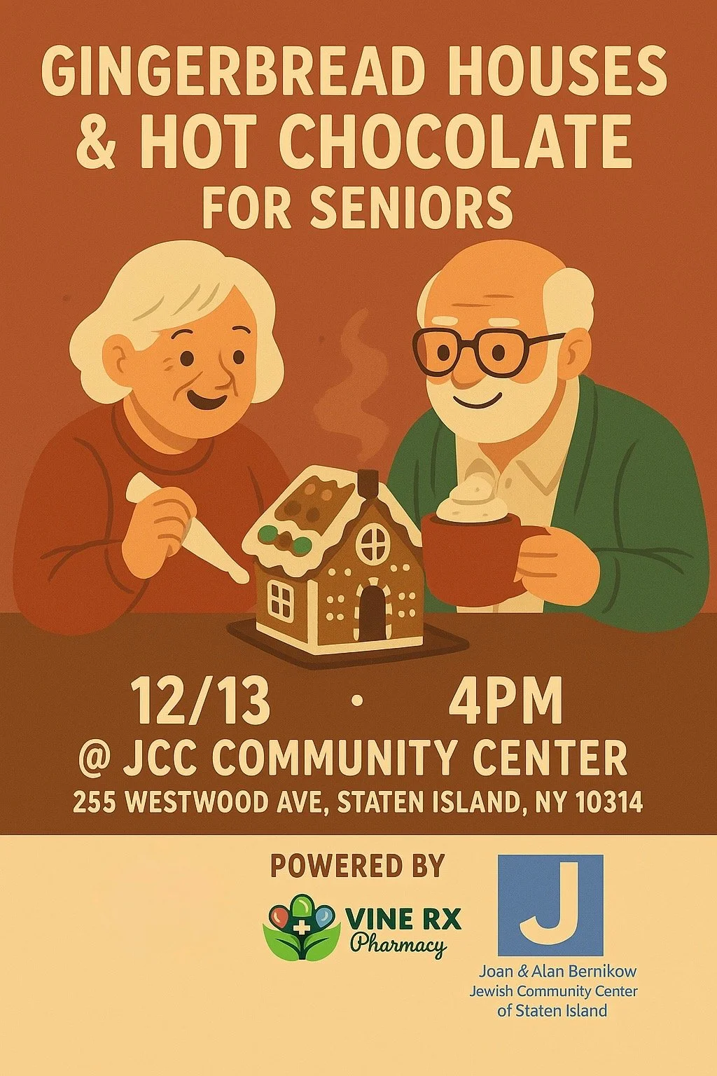 At Vine Rx Pharmacy, our mission is to bring back the true neighborhood pharmacy experience — personal, caring, and rooted in community. We believe health care should feel like family, which is why we’re proud to sponsor heartwarming events like Gingerbread Houses & Hot Chocolate for Seniors at the JCC of Staten Island.